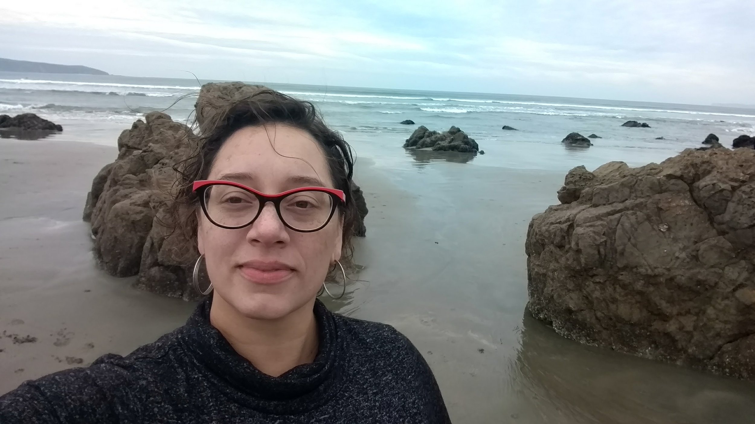 Image: With a soft smile on her face, Kim stands on the shores of the Pacific Ocean in California, aqua waves crashing softly in the background; small lava boulders dot the shimmering sand behind her. Her hair is short, with a bit of dark curl on the right side of her face, touching her red accented glasses, and another small whisp across her forhead. She is wearing silver hoop earings and white speckled black mock turtleneck - giving it a textured and “painted” look. She loves the ocean.